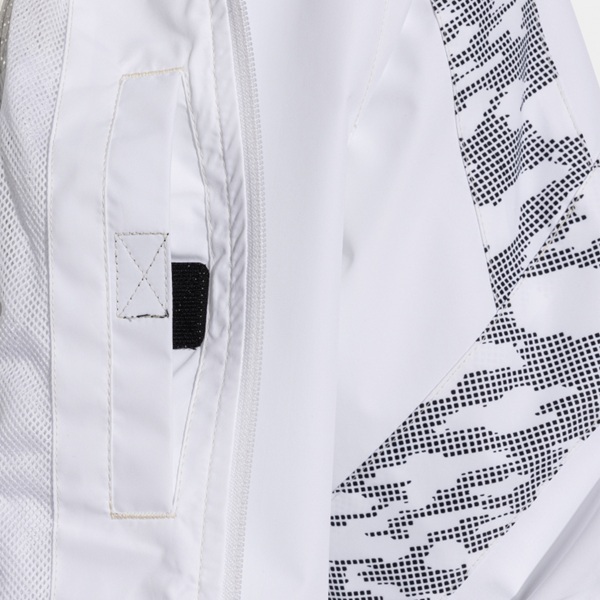 S celoplošným zipsom a chráničom brady zaisťuje perfektné prispôsobenie a zabraňuje nepohodliu. Nastaviteľná kapucňa poskytuje dodatočnú ochranu, zatiaľ čo elastický pás na manžetách a nastaviteľný lem s bočnými zarážkami zaisťujú personalizované prispôsobenie a chránia pred vetrom a dažďom. Vonkajšie vrecká na zips ponúkajú bezpečný priestor na vaše veci, zatiaľ čo vnútorné vrecko so suchým zipsom poskytuje ďalšiu možnosť na drobnosti.
